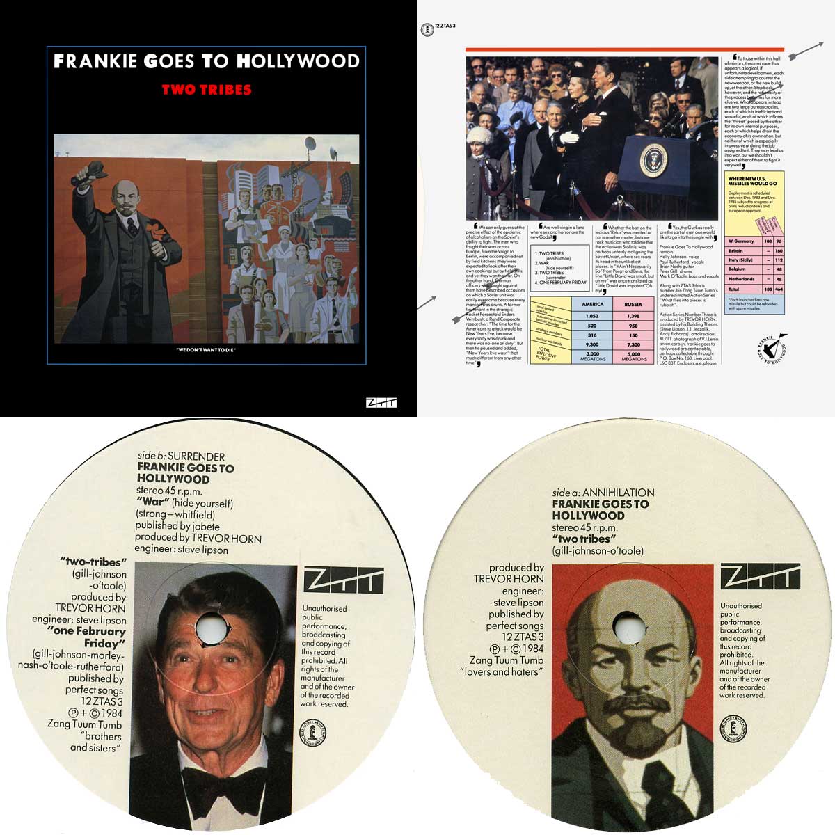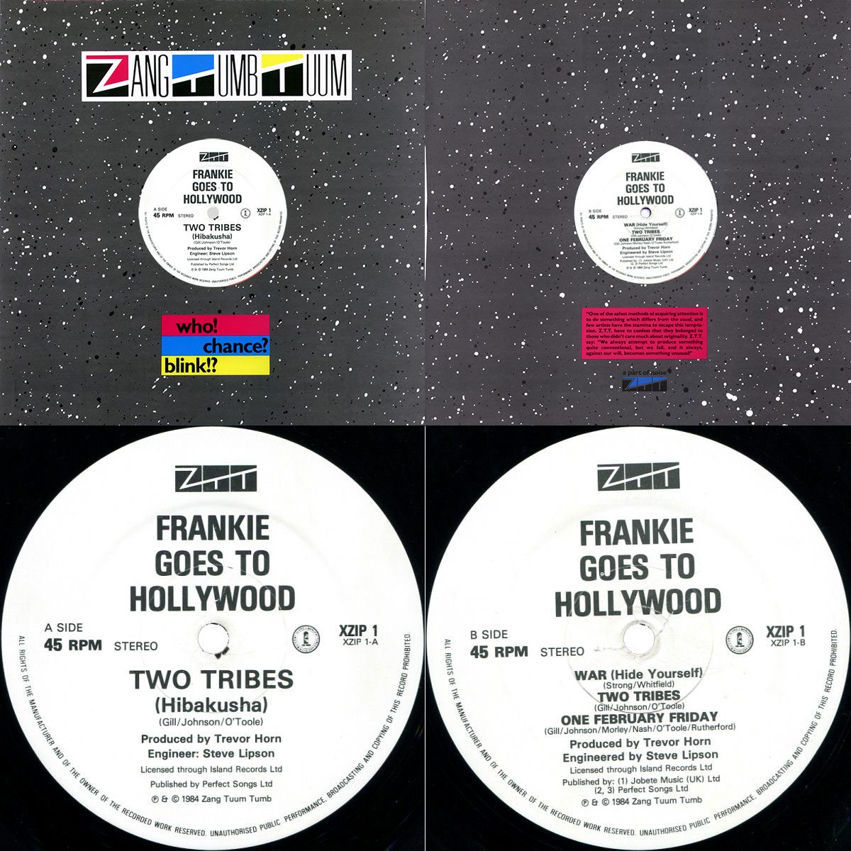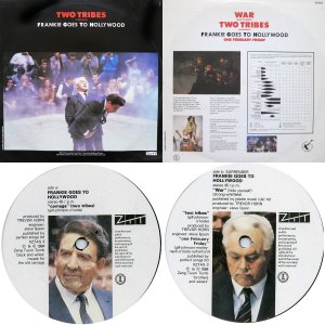 By 1984, the rules changed again. The sound of Trevor Horn with Frankie Goes To Hollywood ruled the UK charts almost all year. And with only three singles! How did they do this? A history lesson, dear readers. I’d first heard “Relax” when it was featured on MTV’s “London Calling” program and was so smitten with it that I listened to a cassette tape I’d dubbed of the stereo FM feed I’d recorded of the program [in those pre-stereo TV days] all day the following day. I bought the import single of “Relax” as quickly as I could. I distinctly remember the first time I heard the next single, “Two Tribes.”