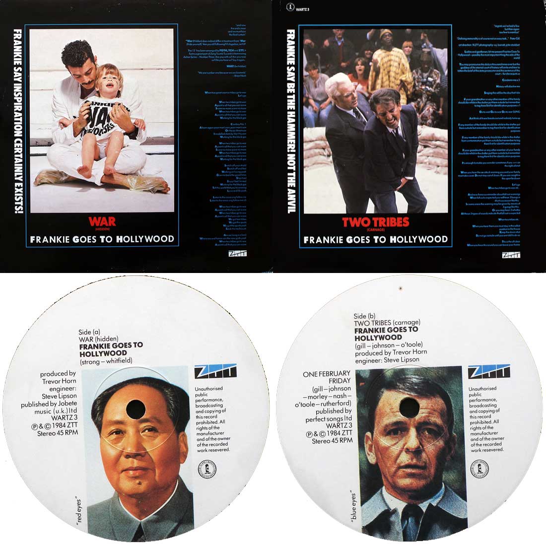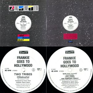 What th’ hell…?!? It looked like “Two Tribes,” only everything about the package had been… remixed. The B-side [a cover of Edwin Starr’s “War”] had been made the A-side and “Two Tribes” was now the B-side of the single. My mind hadn’t twigged to the concept of multiple remixes of the same song, but the packaging was so intriguing, I plunked down my precious money anyway – just to see what was going on here! The record had a second remix of both songs that differed from the original 12ZTAS3 that I had bought earlier. The “Two Tribes” remix in particular had the wonderful middle eight that was not on the first 12″ single.