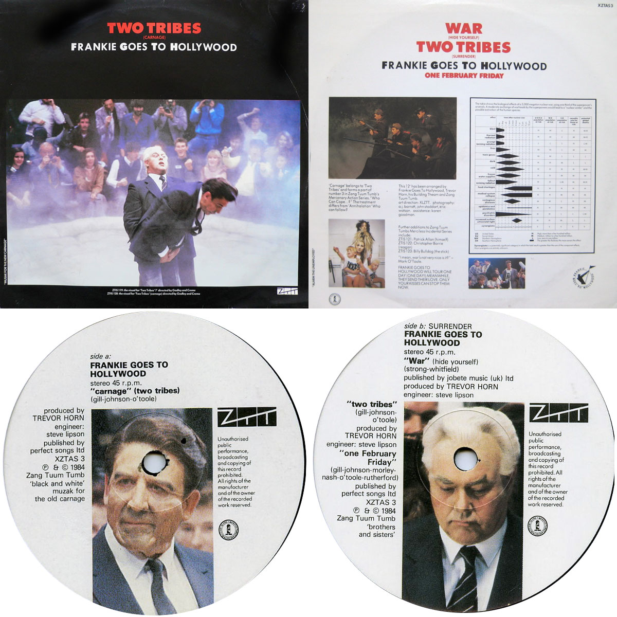 A line in the sand had been crossed, and ultimately erased. ZTT managed to keep interest in the tune via a plethora of remixes released at regular intervals that saw the song in the UK charts all that summer. There were ultimately four different “Two Tribes” 12″ singles. The two described above, [technically one is a “War” single] and the “Carnage” and “Hibakusha” mixes, as shown below.