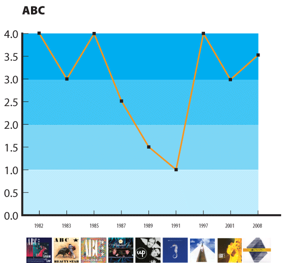 ABC then continued quixotically on a varied path that would see them confound their many fans expecting more of the same at various times in their long, and storied career. Band members would be shed at an alarming rate; leaving Fry with a single consistent sideman in Mark White, with whom he would record six of the eight ABC studio albums. At one point, after Fry and White called it a day, it seemed that ABC had been put out to pasture, but Fry emerged in 1997 with a new album, co-written with the members of the Sheffield band Honeyroot [Keith Lowndes and Heaven 17’s Glenn Gregory] that showed that there was still plenty of power under the newly retooled ABC hood. Let’s take a look at the macro level view of ABC’s Rock GPA®: