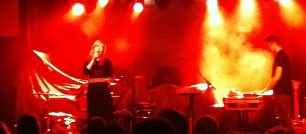 I’d heard of the opening act Austra when they played Asheville in the Fall of 2011 as part of the Moogfest lineup of that year. They didn’t seem like hip hop, so I figured they’d be a safe bet. Being that The Orange Peel is a tight ship, the band came out at 9:00 p.m. sharp and proceeded to make me very glad that I attended. The lineup was keys, live drums, bass with the bassist triggering drum machines and vocalist Katie Stelmanis doubling on second keys. It was a rich, slightly gothic, but definitely not morose sound. The Toronto group brought to mind another long time Canadian synth band fave, The Spoons. Not as upbeat, but the clean density of their sound which blended programmed and live percussion so remarkably well is what reminded me of earlier group. And in a good way. The band’s music had that CFNY ’82-’84 vibe. Yes, it was that good!