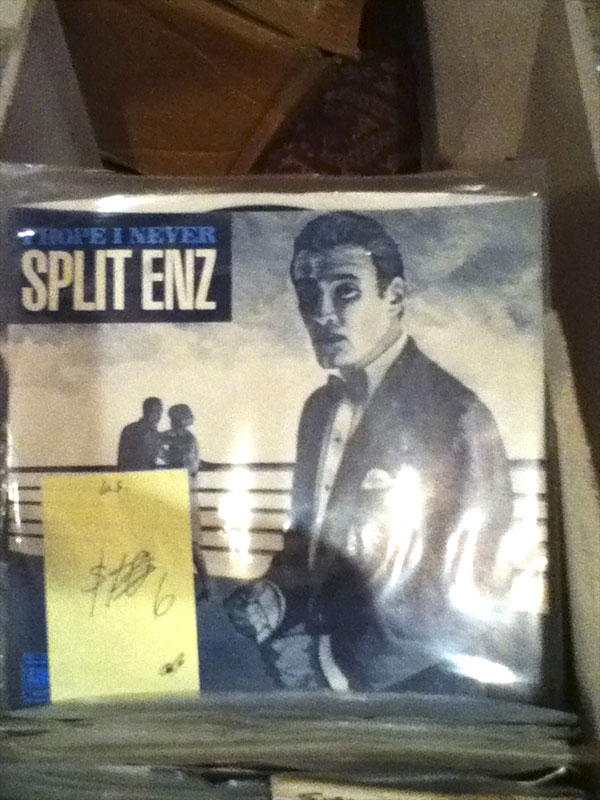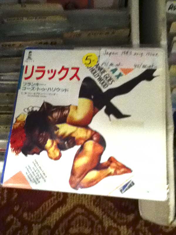 There’s a representative sample in the thumbnails above and many records to love, if not buy. Especially at those clear ’em out prices. Look at that! “All Stood Still” for only $2 more than it would have cost in ’81. It’s the black vinyl version, of course, but still! I don’t think I’d ever seen that US A+M Split Enz cover for “I Hope I Never” before! I quickly sent a snap to a friend who is an Enz collector but of course he had a copy. The Numan was one of the last great Beggars Banquet singles. $8 was pricey for this stock, but have I ever seen a copy of this before? And Begorrah…! Five first issue ZTT Japan FGTH singles for $5 a pop! I can remember a day [before the collapse of civilization] when JPN 7″ers were $12 on a good day and $20-$30 each!! Too bad I didn’t have about $150 to drop on 7″ers I didn’t need, because there was much here to appreciate. But there was a single disc that not only was something I wanted, but it had been on my want list for years!