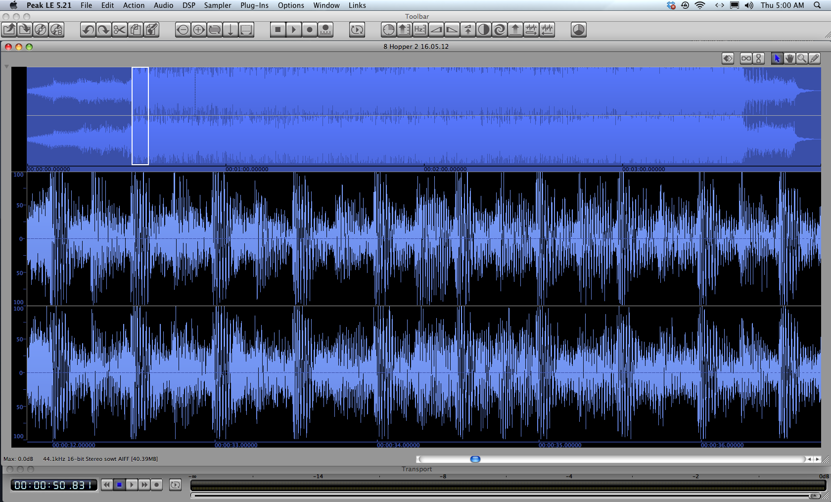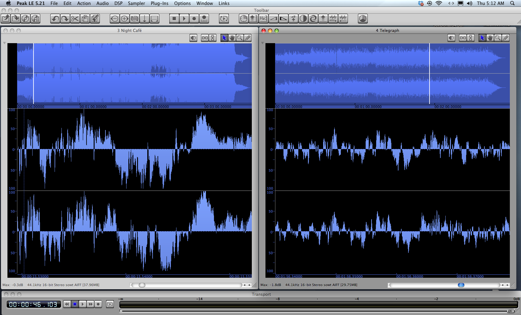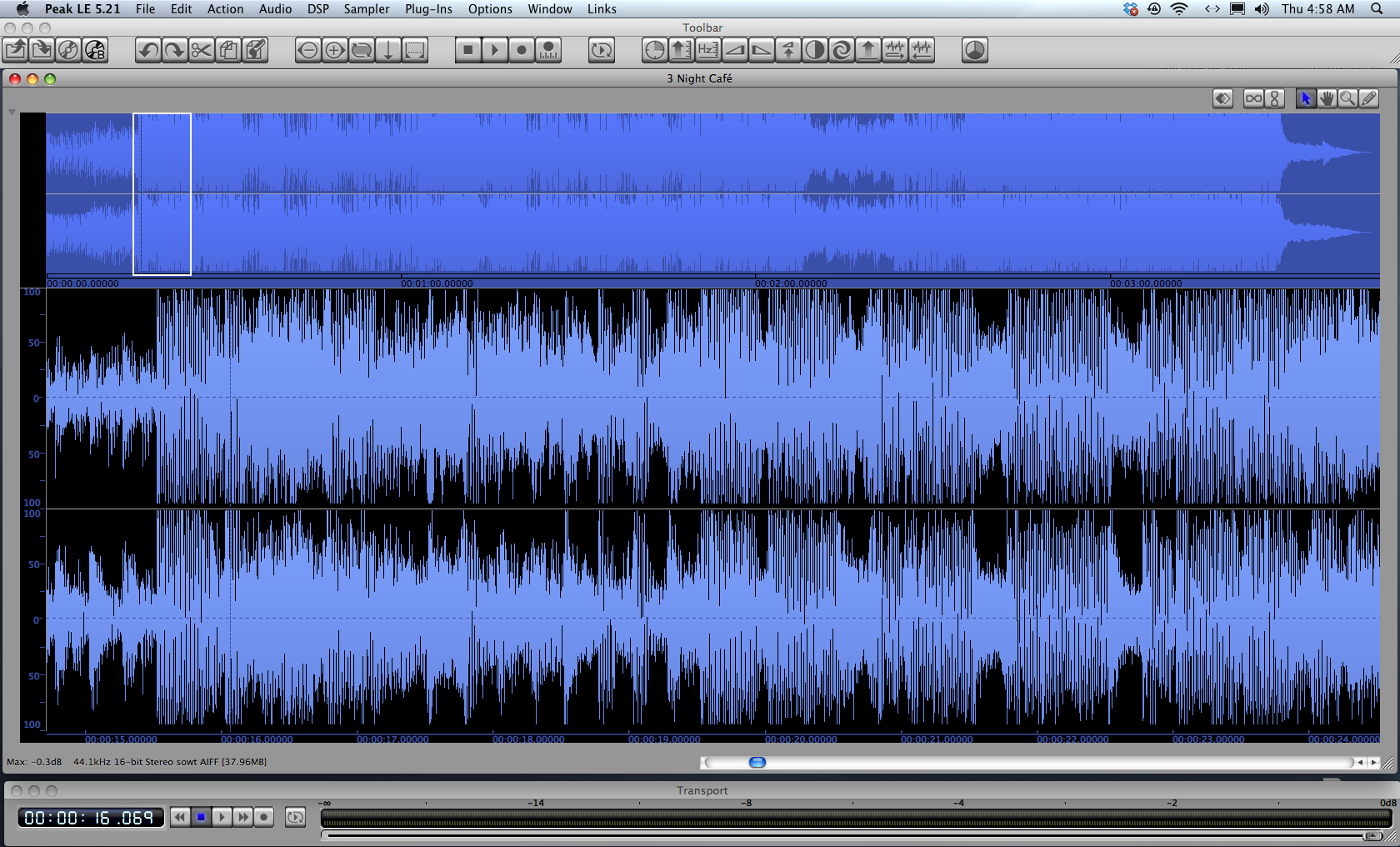 “Night Café” is one of the worst sounding tracks here. A look at the wave form reveals a tightly compressed sound. Zooming in until the wave is at 100% reveals why the sonics resemble rice krispies as shown below.