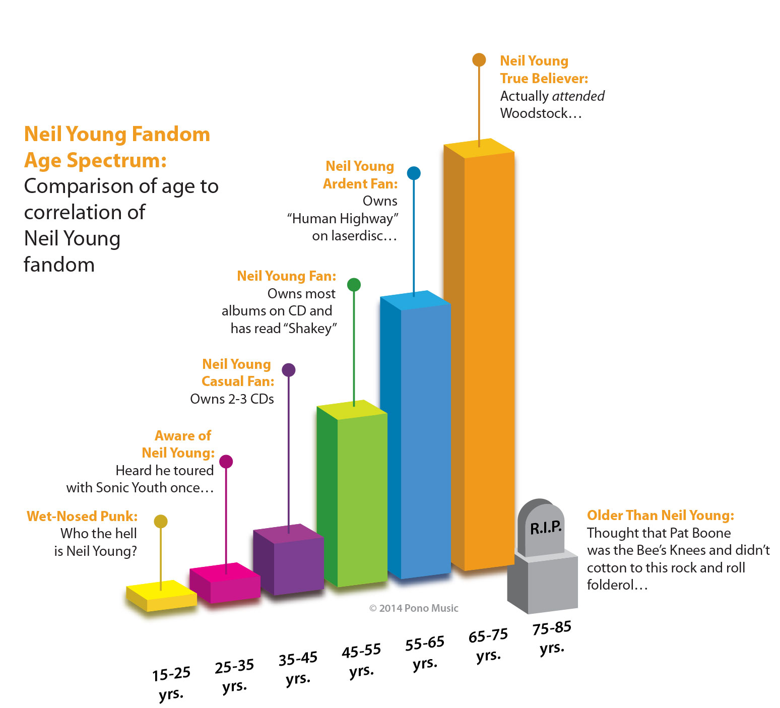 If one is going to deliver six times the amount of data that the human ear is capable of receiving, the ears that will most readily be appreciative of this data fall on those younger than 15 years of age, where the full spectrum of human hearing can resolve sound across at the full 20Hz to 20KHz frequency spectrum. The average human experiences high frequency hearing loss with age, generally beginning at early adulthood and continuing until death, with middle aged males experiencing the most rapid loss of ability to hear about 10 KHz (this figure varies widely). That’s nothing to sneeze at, but when the life of Neil Young is examined, as the above graphic not quite stolen from Pono labs reveals, it tells a dramatically different story.