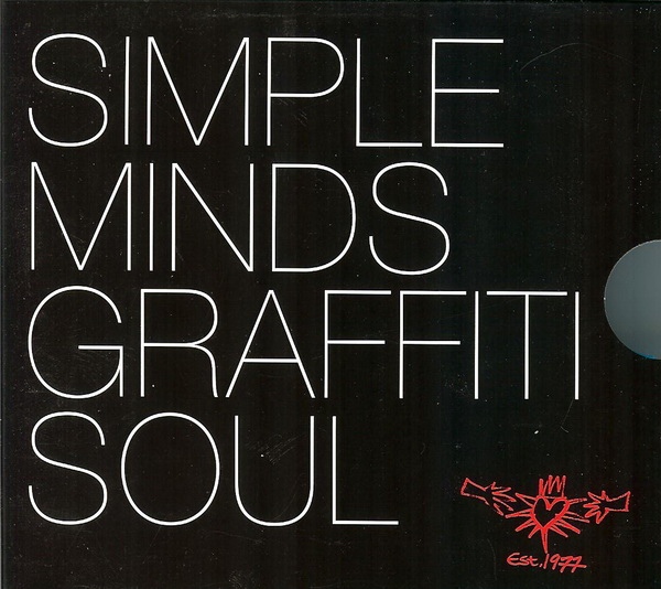 The next Simple Minds album took a stately four years to materialize, and when it did, it was in a deceptively plain, black sleeve as designed by the Edinburgh design team Curious. Inside the black cover were violently colorful art and lyric pages heavily influenced by famous artists Gilbert + George. There are no images I can find online from the booklet, but this t-shirt image from the Simple Minds shop with a “Graffiti Soul” design can get the point across. Similar imagery informs the design of the booklet.