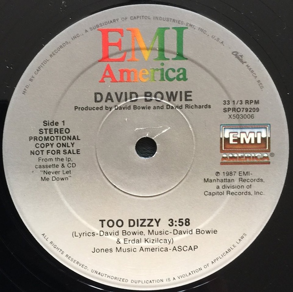 It’s true that I reserve the sharpest of critical knives not merely for albums that fail. These are a dime a dozen in this fallen world. No, I reserve my harshest judgement for albums that try and and still fail. Does that make me negative and cynical? I hope not! But the fact remains that for every good idea on this record [and it has a few], there were at least six bad ones ready to be used without much regard for integrity or even his legacy. Adding insult to injury, “Too Dizzy,” the song struck from the running order by Bowie in 1995 from all subsequent copies, at least had some lively backing vocals. Even if the song’s intro sounded like library music for a TV morning show bumper. Harsh, but true. Even so, it’s a measure of how off target this album was as evidenced by the US promo 12″ of this title that EMI America pressed up in a fit of blind optimism.