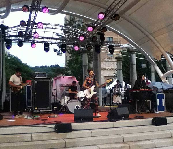 After the span of eight or so songs, Ms. Michéle announced their last number and sure enough; it was 7:50. In spite of the rain delay, they were ending on schedule, so their set list was shorn of at least half a dozen numbers that we did not hear this damp evening. Damp from the rain, to be sure, but also damp from the perspiration of dancing for close to an hour in a city square. By this time I was not the only one dancing and the square had returned to having some sort of audience; perhaps close to the numbers that were there before the rain. For their last number, I was pleasantly shocked that they trotted out their killer Dillinger cover of “Cocaine Blues,” since this was definitely a “family friendly” event with face painting, and children. Too bad for the kids. I was all too happy to sing along with the hook that Dillinger had cribbed from The People’s Choice 1975 jam “Do It Any Way You Wanna.” Special thanks to Fred for helping my ailing memory here.