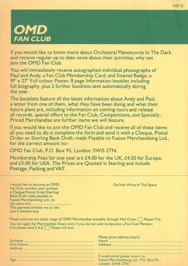 It was two months later when I got the news that Record Mart Warehouse [my favorite store at the time] had the new OMD album on import and I wasted no time in getting down there and buying a copy. 1981 was an interesting year for me. I was graduating high school, starting college, and my music listening was insanely active and the role payed my import vinyl in my life was exploding. I was honing in on import albums as being in my best interests and my attention to import singles was just around the corner. I bought the album and took it home; admiring the die-cut cream sleeve from Peter Saville Associates. The inner sleeve could show one of two photos in the front of sleeve window, but to me, the cover must always look as shown on he sleeve above. Inside was an insert for the OMD fan club in green ink on matching cream paper [see left]. It tantalized me with offers that were pretty much out of my reach with the impossibility of paying for anything in a foreign currency at that point in time. Life before PayPal was no walk in the park in this regard.