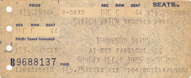 So when I found out that on December 8th that The Thompson Twins with OMD opening were at The Fox, I called Jim Ivy up and when he said he was going, I boldly invited myself along. I look back now and shake my head at my temerity, but these were desperate times! I was not getting a steady diet of Ultravox or Simple Minds shows pitched in my direction. If I could drive ten hours and see OMD, who were already fat in my Record Cell, then all bets were off! Fortunately, Jim acquiesced and on the Sunday morning of December 8, 1985, Jim’s work buddy, who was driving, came by and picked me up.
