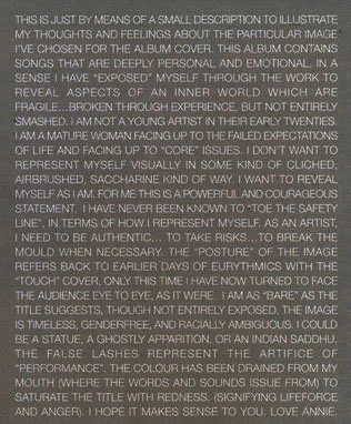 It was another four years later when Ms. Lennox continued with her solo career. I was gun shy by 2003. I did not buy a copy of “Bare,” but I didn’t need to. My good friend Mr. Ware had been given a copy and it did nothing for him, so he passed it onto me. Not a sterling endorsement by any stretch of the imagination. I gave it one play and it was more musical helium. Soft airbrush synths of little weight given to ballads that made no impact what so ever. Actually the cover was the most interesting thing about the album! No, scratch that. Her liner notes on the back cover were much more interesting than the music on the disc.
