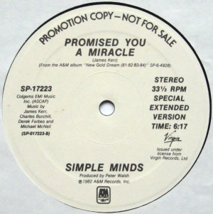 Next came the first revelation of this disc: the “US Special Extended Remix” of “Promised You A Miracle.” The stinging irony of this record was that I have seen it in the used bins from day one… and I never thought twice about it because I assumed that it was just a WLP [white label promo] of the commercial 12″ as seen above in the previous paragraph. The timing seemed to be similar to what I remembered on the commercial single. But I could not have been more wrong. The EQ of the track was immediately different with a finely etched treble colored sound that was arranged very differently to the commercial issue. The commercial mix had its middle eight at the 3:00 minute mark as the flanged guitar and drum track took the spotlight for a few bars. Instead, this mix delayed the bridge until 4:07 and even then the guitar had a different EQ and Jim Kerr was vamping in the mix without the four bar breather in the commercial mix. The song played out with Kerr ad libbing over the longer fadeout. Fascinating, Captain. How I wish that I had not waited 37 years before hearing this alternative remix. The