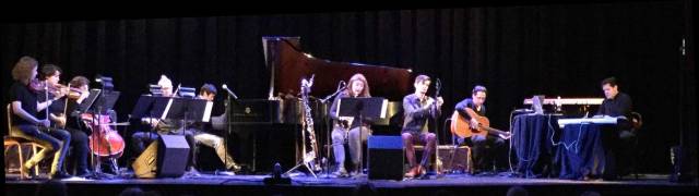 The performance was an expansive 90 minute version of “As Long As I Can Hold My Breath” from Avalon Sutra with ACME strings, Tim Story [keyboard & electronics], Terrence Budd [guitars and keyboards], Sean Connors [percussion], Lisa Raschiatore [clarinet], and Trenton Takaki [piano]. Budd did not play piano this time, only synth as Trenton Takaki did the honors on the 88 keys. As with the earlier performance with ACME, I was astonished at how they managed to play such long, slow drone notes and that capacity was stretched to the limit here as the entrancing beauty unfolded in the vintage theater. This was really the most familiar performance of the festival thus far.