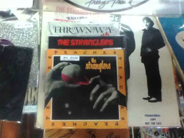In the glass case I saw a fine selection of classic material from The Stranglers; including the black + white vinyl copy of “Black + White” that was the first thing by them I’d heard. Lots of tasty 7″ picture sleeve action too! Any 40 year old picture sleeve 7″ singles get more then my cursory interest. I looked around further as the dealer had a fair amount of stock. All of it seemed to be reasonably priced as well. Nothing makes me madder than seeing nice goods at far above market norms; as is common in the antique market. Then as my wife was also looking, I found a holy grail item.