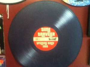 As usual, coming to Time Traveler was like coming home. This is one of the record stores in another city that I’ve visited countless times. Right up there with Wax N’ Facts in Atlanta for greatest familiarity in spite of greatest distance. As I entered I noted that owner Scott Shepard was holding court on this Friday afternoon with several guys… and a woman! So it was not just us old geezers! The store was playing some bootleg material as their animated conversation was underway. At first, I had to just look at the stock, but this was the sort of store where one could easily jump into such conversations and that would come later. Inside on the store’s wall was a re-branded V-disc with their name on it. Cool!