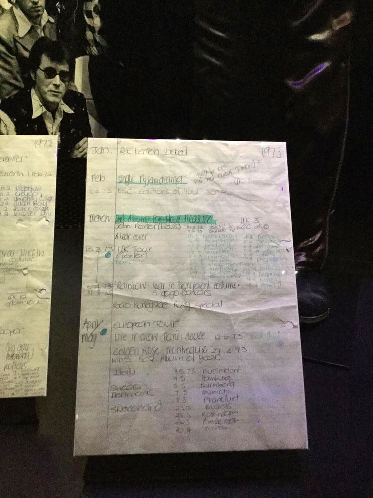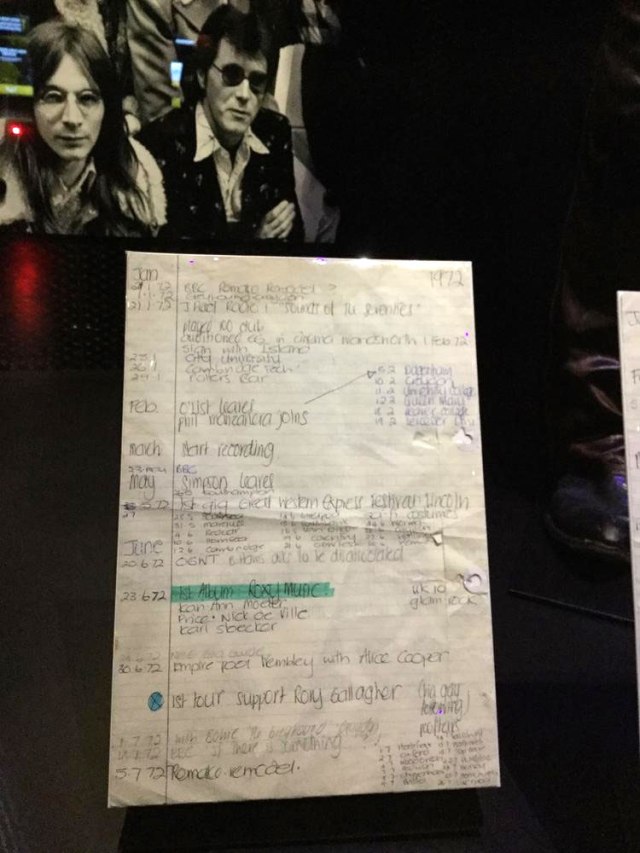 I thought my wife took a photo of the amazing Phil Manzanera “fly-eye” goggles from the interior of the debut album gatefold, but all I can see is the descriptive text in our photos. The 1975 “Siren” tourbook is something that I’ve actually held in my hands and read once, when a British gent called Jez met me over at Armadillo Records one afternoon. I’ll never forget that the opening act [who got a page in the tourbook in those earlier, gentler times] were the Sadistic Mika Band, featuring future YMO drummer Yukihiro Takahashi! The owner had told him that I was a big Roxy fan so he brought over a box filled with bootlegs and that tour book for me to view. Possibly the most interesting item here was Bryan Ferry’s timeline/daytimer from his notebooks detailing what happened and when during the first two years of the band. They are just barely legible if you click to make them larger.