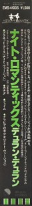 Due to the enormous popularity of DD by 1982, this EP got imported pretty much everywhere where records were sold. It was the first Japanese record I every remember seeing in stores, that’s for certain. It graced many an import section I recall browsing. We all got introduced to the notion of the obi [see left], or paper band with the Japanese kanji text so that buyers locally would be able to know what the record was about if they didn’t speak English. If one could read Japanese, this would probably be like a deluxe “hype sticker” and every release got it. One of the most interesting things about obis was that they told you the date of release for the record, but also had the price listed on it. This EP was ¥1,500, or about $15 US dollars. US importers usually placed a premium on Japanese records, so this went for $15-20, back in the day. I did not buy it new, but found a used copy at Crunchy Armadillo Records some time in 1983, I’m guessing. It’s been in the Record Cell ever since. I bought it because I already had the “Careless Memories” UK 12″, where the two non-LP B-sides here came from. As I’ve already written about those, we’ll concern ourselves only with the “Nite Versions” available here.