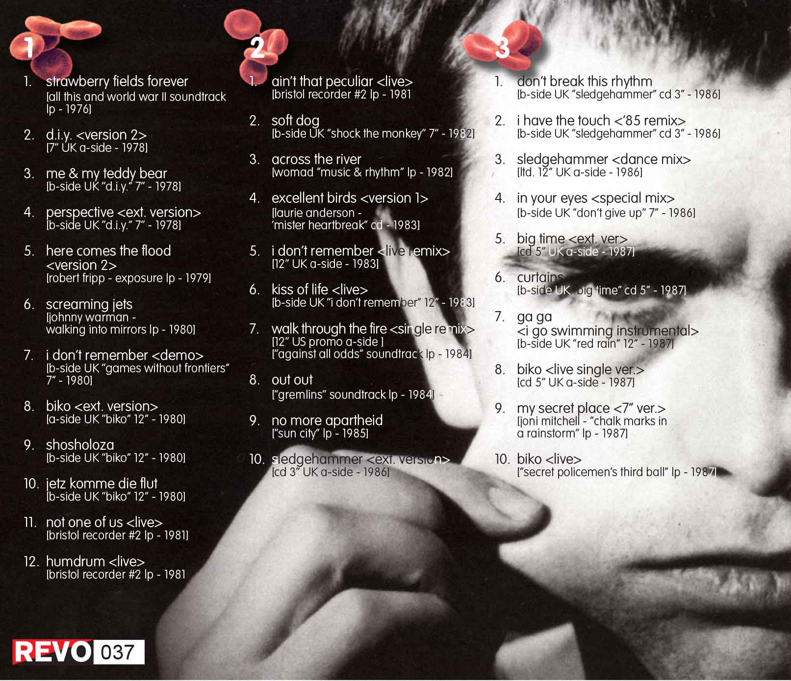 This was a big, fat core dump of 62 cuts. Almost twice the 32 tracks of my more modest set. But anything he did after “So” had not resonated with me. And though the rarities from that album period are slightly stronger than the bulk of the album itself, there were a few things done immediately afterward that weren’t too bad. I didn’t like “Shakin’ The Tree” or anything else after that I’d heard. So now I’ll compare and contrast with my own set.