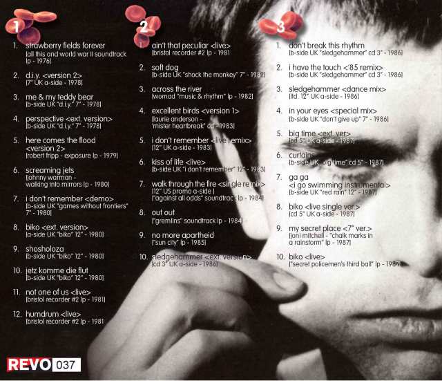While the title of my set is admittedly perfunctory [I’d used it earlier for another 3xCD-R of rarities by Bryan Ferry in 2003], It looks like I was on the front end of the zeitgeist train by choosing to use blood platelet imagery along with photos of gabriel in the packaging. I seem to recall that I took the opening footage of the “Sledgehammer” video as a jumping off point for the design and thought to myself, “blood cells – that’s what this design needed!” Then following the “Scratch My Back” album of 2009, gabriel began using blood cells the way Simple Minds used Claddaghs!