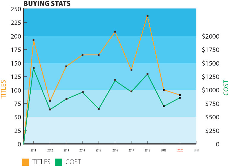 So the painful reality of things is that last year was my least efficient year since maintaining records again from 2011. I spent about 75% of my largest outlay for a middling amount of titles. the two graphs are overlaid at 10:1 scale with the two dots for 2020 almost reaching parity; indicating nearly $10 spent per title! An all time high. The closer the two dots are on the vertical axis are, the more expensive the music was to buy. 89 titles for nearly $900 was not an inexpensive average. Quite the opposite.