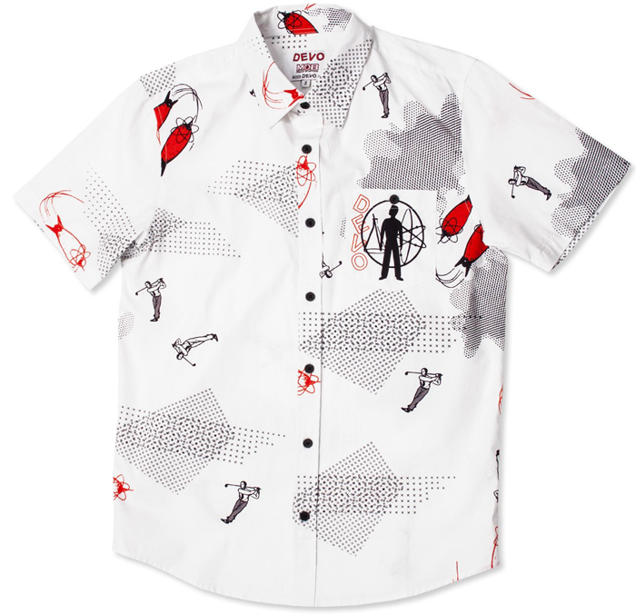 negative1ne – While the hazmat suit was a classic DEVO statement, this is much more wearable while being a very busy, action packed design. Give me any clothing showing “atomic bombs in tailspin” and I roll over like a puppy and capitulate. The original leisure shirt in the late 70s [the band wore it in some of their 2nd album videos] was manufactured from TYVEK® because it made as disposable stagewear! I would wear this out while the hazmat suit would be more like a costume for me. Different strokes, I guess.