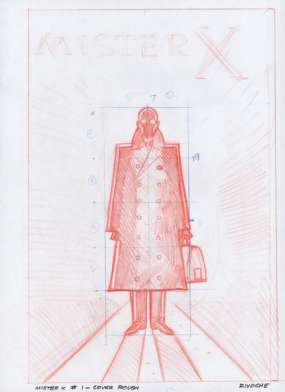 …That led me to here! The 1984 comic book, Dean Motter’s Mr. X. The Art Deco science fiction comic that was [ironically] inspired in part by the Ultravox song on the previous record. Seeing the Currie photo make me wonder if cover artist Paul Rivoche from the comic had seen these photos in print somewhere before prior to his layout sketch of the first issue cover below. Ultimately, the layout was drawn with expansive areas of flat color with no shading; poster style.