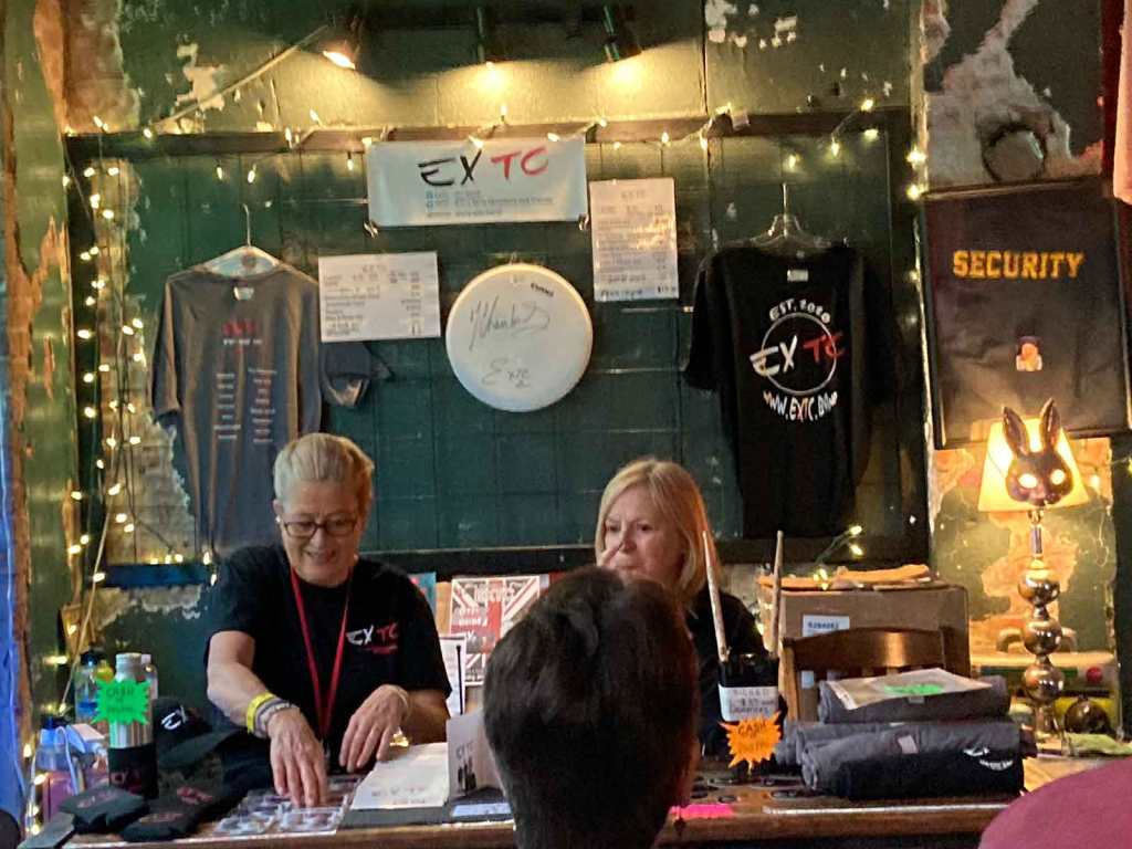As I can’t help but scan merch tables, I was noting Terry Chambers autographed drum heads, as well as the usual T-shirts and, gloryoski… an EXTC “Live in the US” CD that was apparently recorded on their US tour in 2024. I made a mental note and we moved to enter the main room from the hallway. I shouldn’t buy any more CDs as I’ve currently got about 1000 discs culled from the Record Cell in boxes to eject from the collection. And I’ve so many tour shorts that the cabinet needs a culling as well!