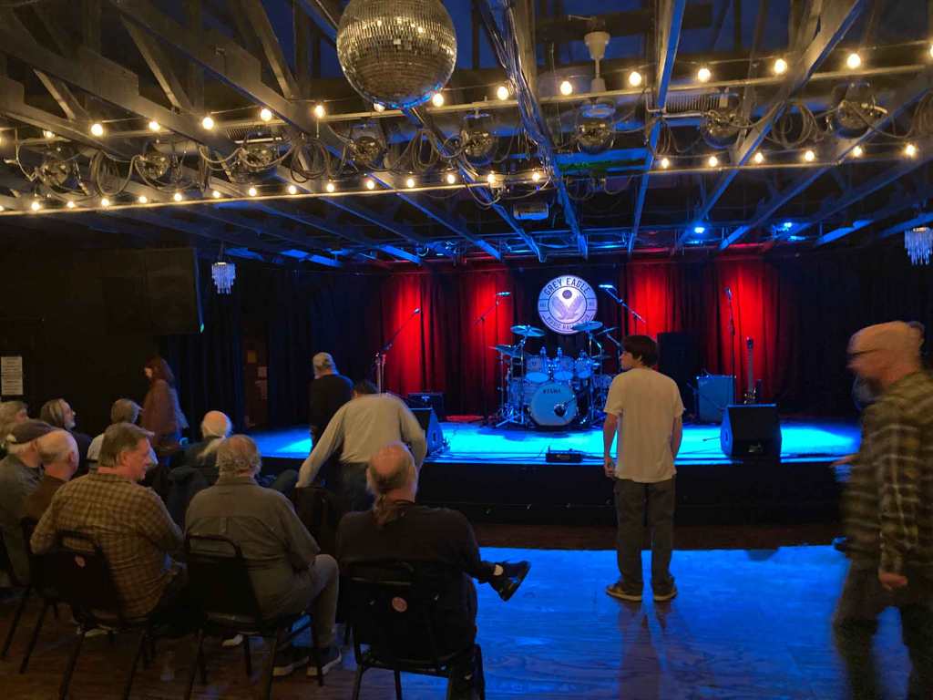 We reached The Grey Eagle at a quarter after seven when were open for the 8 p.m. show. As I often see shows there with scant crowds in a “pearls before swine” situation far too often for my tastes, I wondered what this night would bring. Parking was a little dicey but I’ve had worse. We entered the club and scanned our tickets to see a light crowd but already far more than the tiny crowds I’ve seen shows with there. I did a ad hoc head count and there were about 80-90 there it seemed.