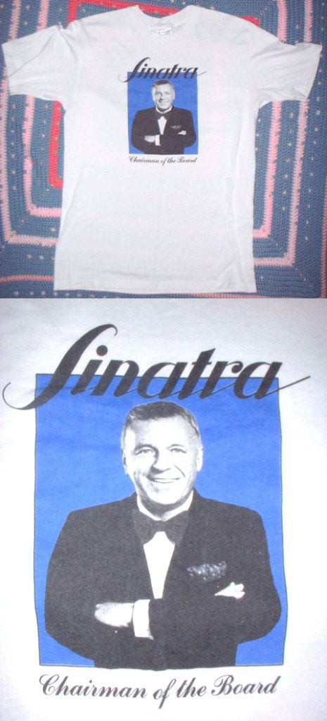 Round two with Frank Sinatra was a far more enjoyable event. My friend Jayne and I went with her mother this time. We bought primo seats and the show was night and day [pun intended] superior; a classic program of “saloon songs” with the only false note being the de riguer closer of “New York, New York.” Frank was in top form and since it was the 90s, we hit the merch table for this tour shirt and the program book.