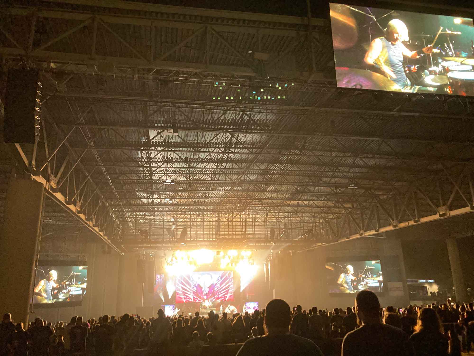 The video feed on the jumbotron featured lots of live inserts from the action onstage, which was helpful since we were pretty far back. The actual band seemed about as big as dolls on the stage, as the pics from my seat reveal. I’m usually cold to the idea of watching a concert off of a huge video screen, but I’m usually in pricier seating as well. So the evening would be a weird blend of watching the stage, watching the jumbotron behind the stage, and watching the large monitors flanking the stage or even the one closest to our seats; hanging off of the roof structure. Going to a show this large out of doors was really stepping outside of my comfort zones even more so than the genre stretching to include Metal in my musical diet. It’s not like I hadn’t seen Janes Addiction or Killing Joke before. Still, at least it wasn’t a stadium. The crowd here were waaaay better than my sole 1983 stadium experience…seeing a Rock Superbowl® with The Police.