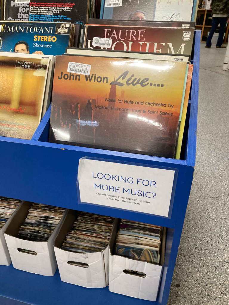 As I surveyed the record store within the larger store, my bile rose. I even saw sections of easy listening music. Now those records were priced at $0.25! But there was a small sign at the end of the row of bins. In small type, maybe 16 pt sans serif, it said “CDs are located in the back of the store…across from the restrooms.” So there were CDs here. It’s just that they were in the least desirable part of the store real estate. At that point they might as well have said “on display in the bottom of a locked filing cabinet stuck in a disused lavatory with a sign on the door saying ‘Beware of the Leopard.”