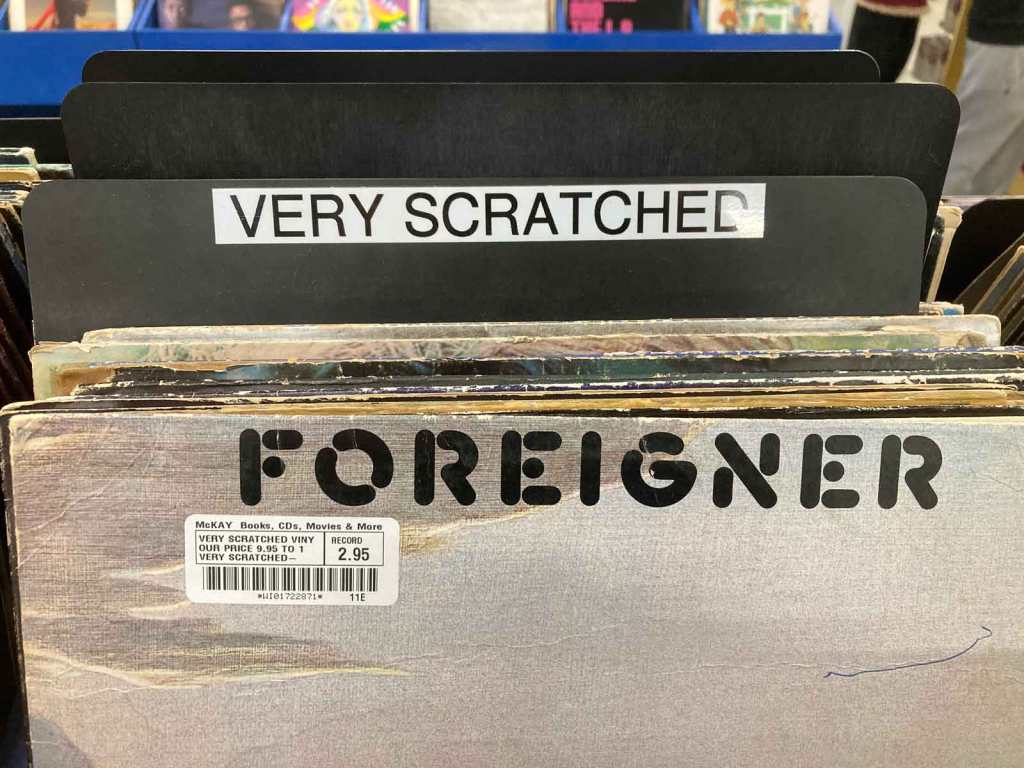 I glanced through the bins and there was nothing of interest. But I will admit that their organization was peerless. The stock was easy to browse. They even had a section marked “VERY SCRATCHED.” I looked at it, curious to see what a “very scratched” record would sell for here and the front bin said it all. If I so desired, I could buy a copy of the debut album by Foreigner, [with a gun to my head…it could happen] that was “very scratched” for only…$2.95.